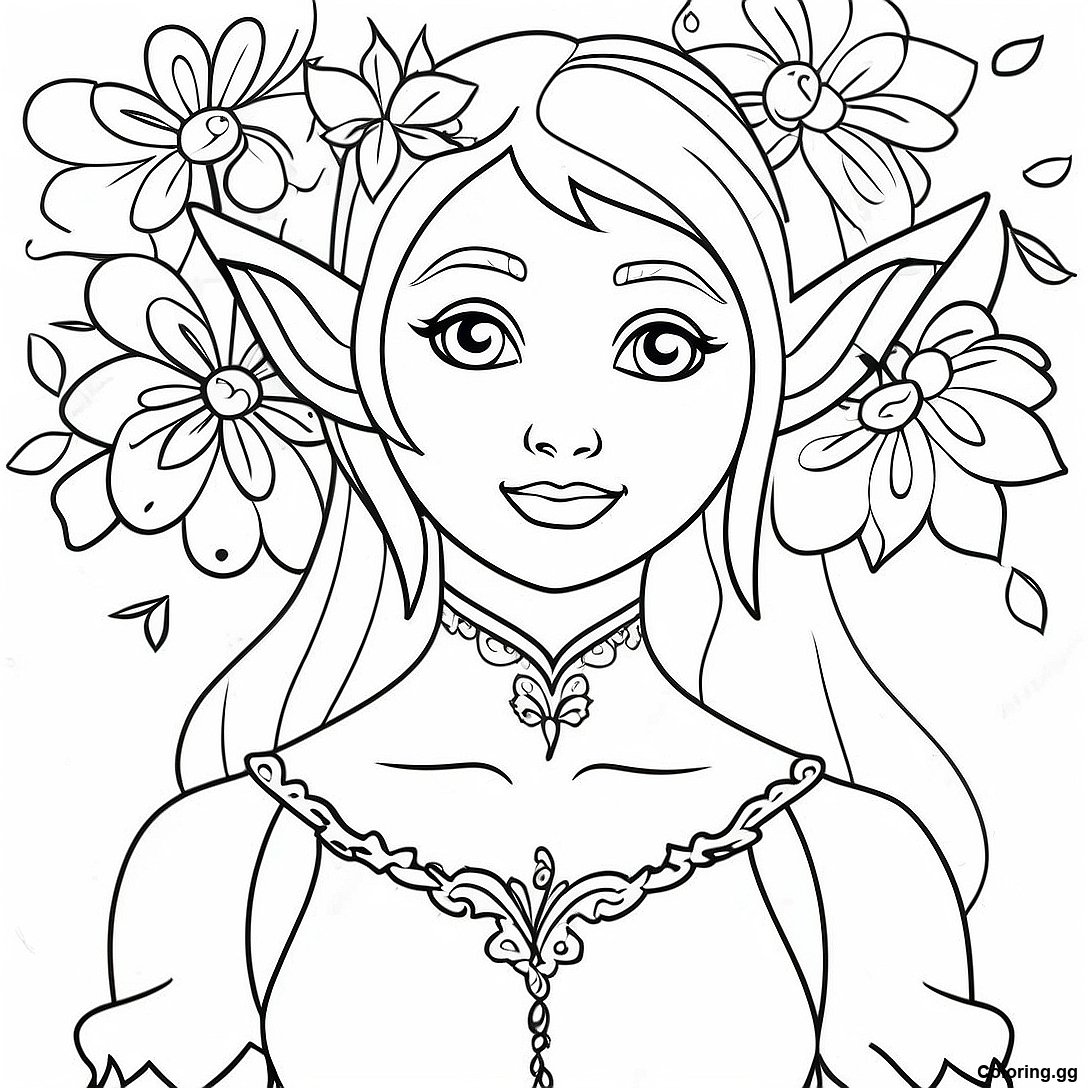 הורד PDF להדפסה של דף צביעה של אלף ריאליסטי אלגנטי עם פרחים