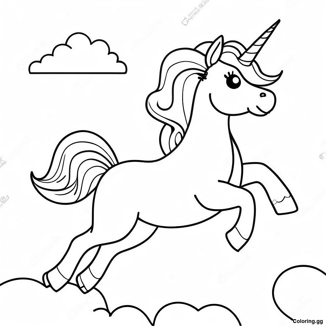 דף צביעה של חד קרן שובב רץ דרך עננים
