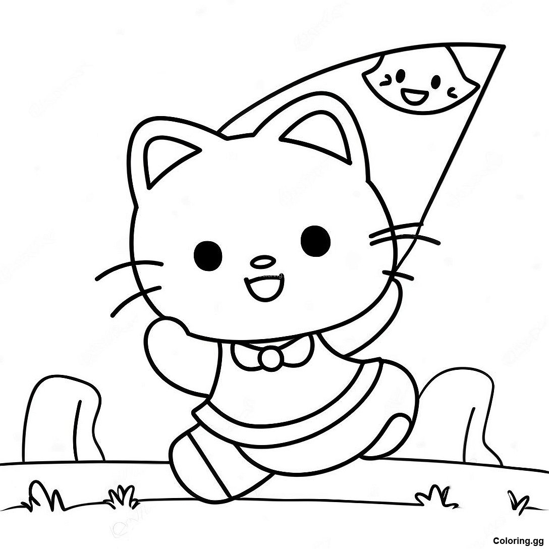 הורד PDF להדפסה של דף צביעה של הלו קיטי המשחקת עם עפיפון