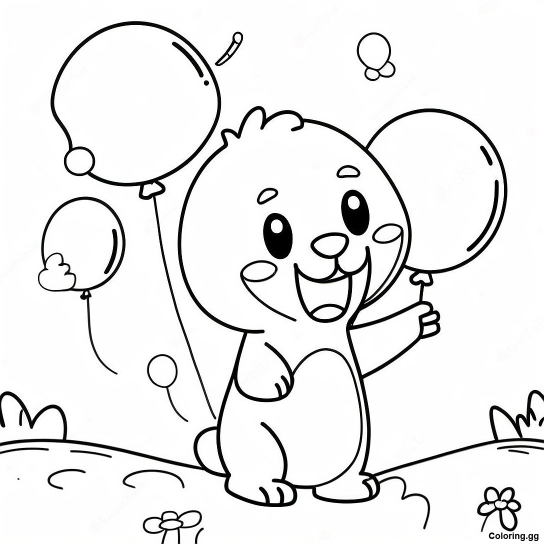 הורד PDF להדפסה של דף צביעה של פוצ'קו שמח עם בלונים