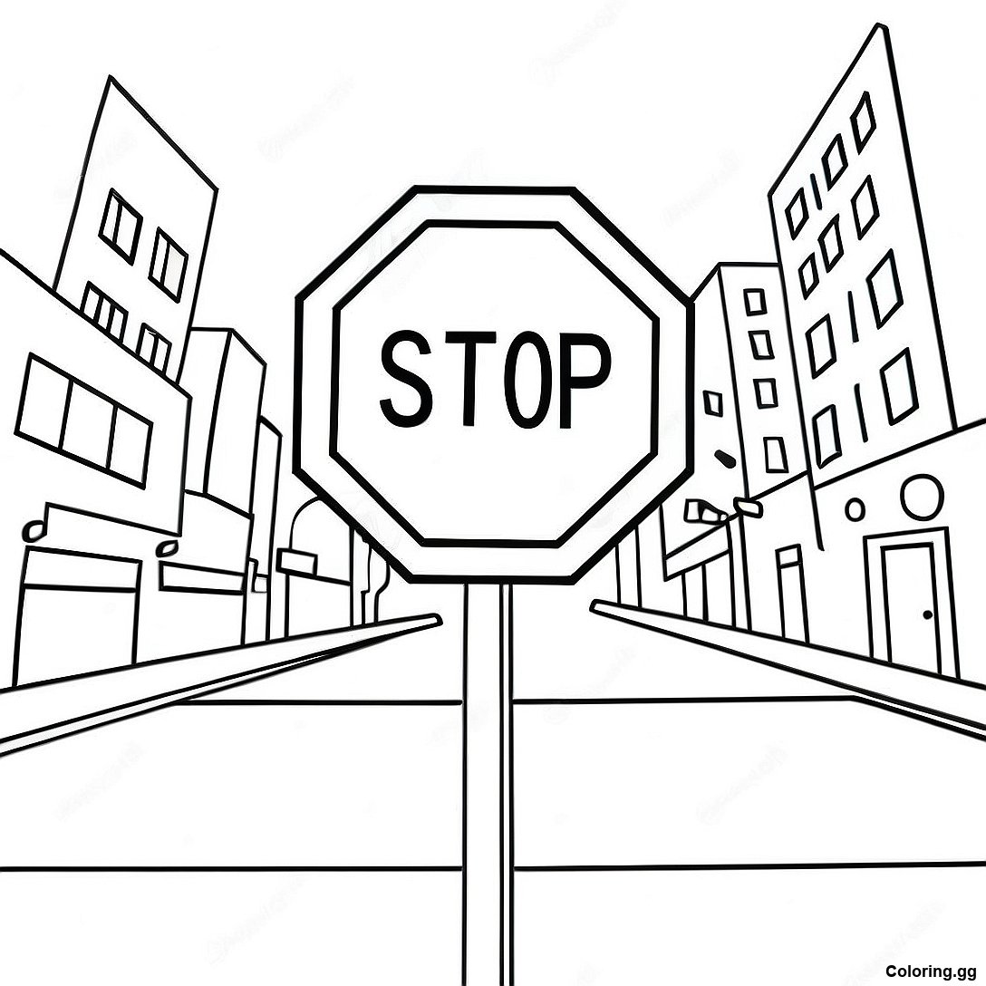 הורד PDF להדפסה של דף צביעה של שלט עצור מצויר בעיר